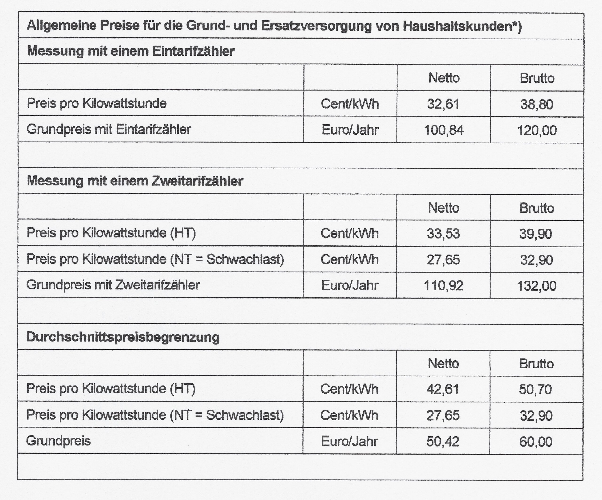 Allgemeine Preise für die Grund- und Ersatzversorgung mit elektrischer Energie. Dieses Preisangebot ist gleichzeitig das Preisblatt zum Allgemeinen Tarif gültig ab 01.01.2023